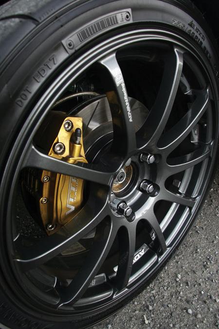 有了极具杀气的外观後,其底盘的犀利度亦必须加强。Summit先将其前後避震筒更换为车高、软硬32段调整的BC运动型避震器,再搭配前10、後8kg弹簧取代原本过於舒适的悬吊设定,而轮圈则为外型质感极佳的Advan RS 18寸中空式样,组合225/40/18的Yokohama Advan AD07跑胎。制动部分则是采用VTTR锻造六活塞煞车组,碟盘未来会换上大径的330mm尺寸。此车动力目前暂时维持原厂样式,只更改Simota 碳纤维高流量进气系统来增加进气量,未来有可能会换上K20A红头引擎与六速手排变速箱。 |